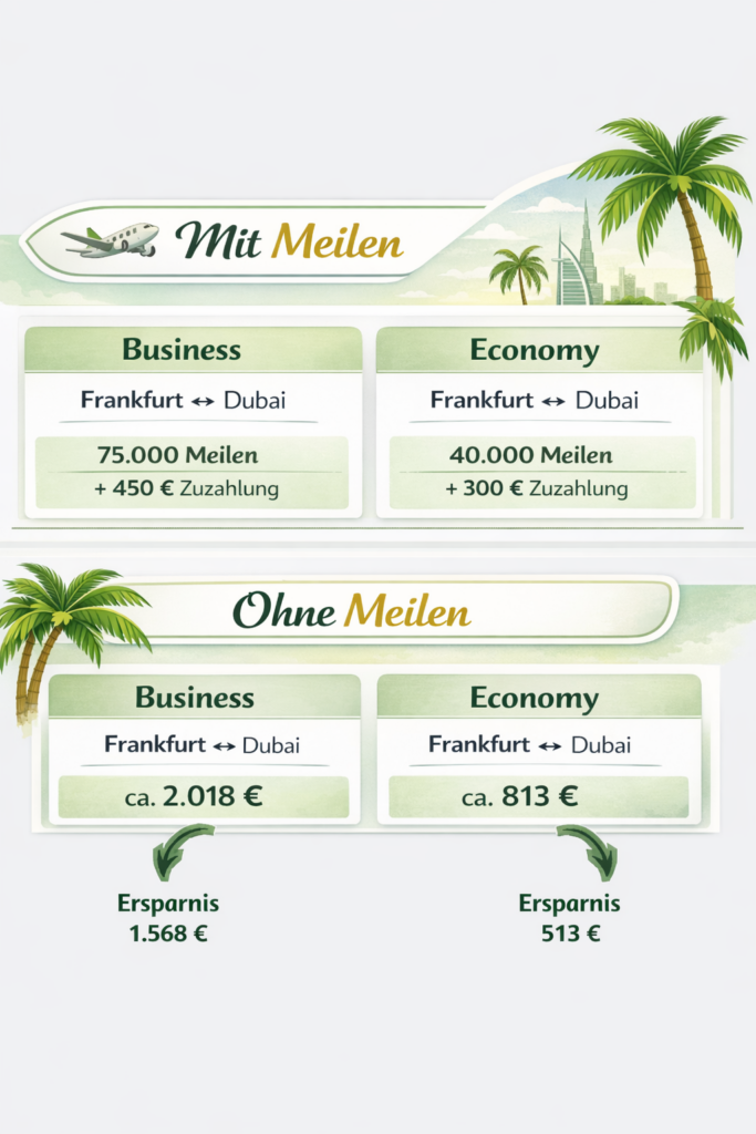Meilen sammeln ist also nicht nice to have oder irgendein nerdiges Hobby. Es ist ganz simpel: bares Geld. Für Reisen, die du dir sonst vielleicht nie gegönnt hättest und die plötzlich möglich sind, obwohl dein Konto nicht spontan Millionär geworden ist.