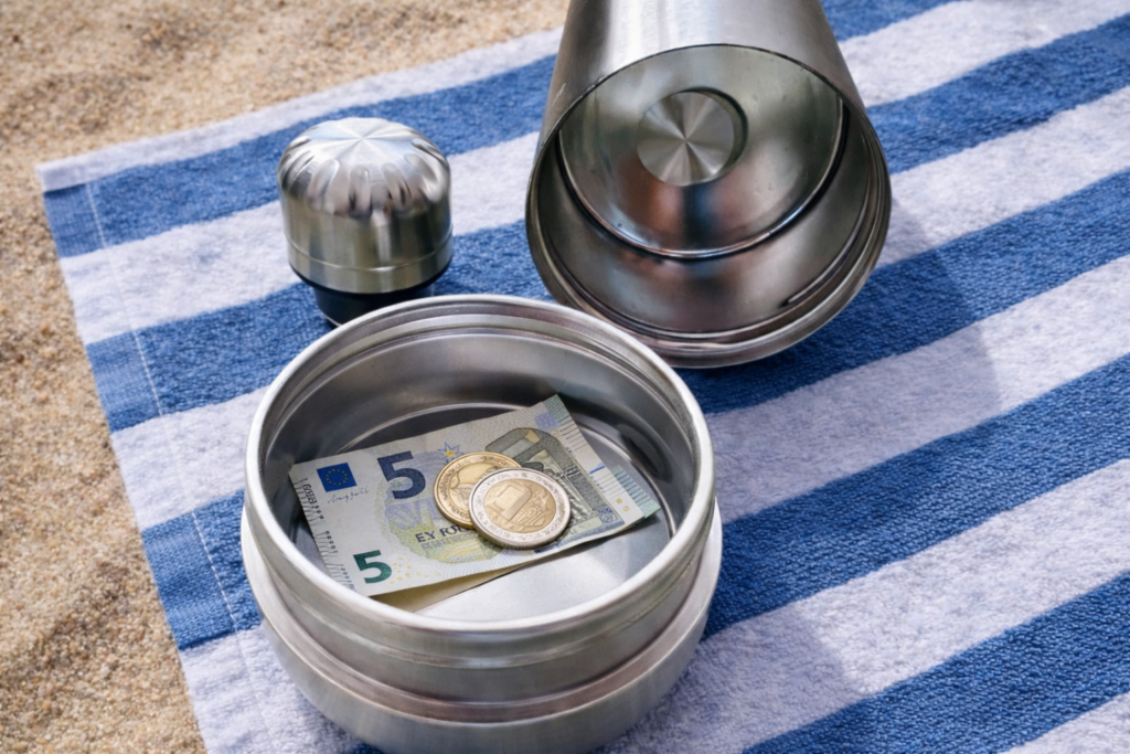 Du bist solo am Strand, willst kurz ins Wasser und hast keinen Bock auf den Klassiker: „Bitte pass mal kurz auf meine Sachen auf.“ Verständlich. Aber heißt nicht, dass du deinen Geldbeutel einfach wie ein „Nimm-mich-mit“-Schild aufs Handtuch legen musst.