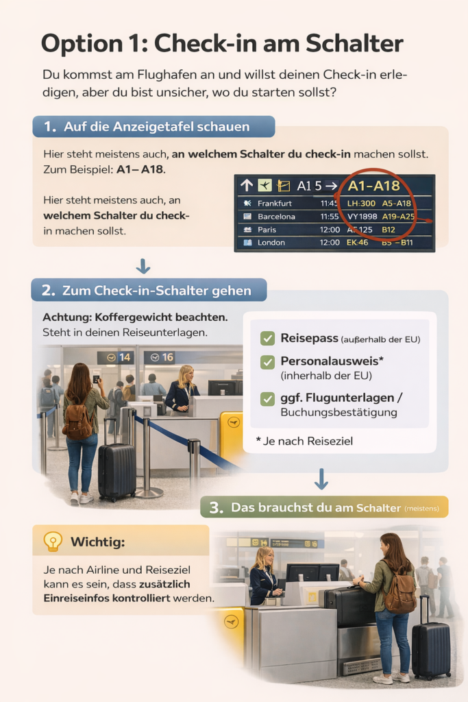 Wenn du am Flughafen ankommst, schaust du zuerst auf die Anzeigetafel nach deinem Flug. Dort steht meistens auch, an welchem Schalter du einchecken musst.